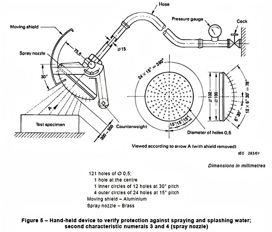 This device is manufactured according IEC 60529 figure 5, it can achieve IPX3/ IPx4 hand-held sprayingtest by connecting water pipe.