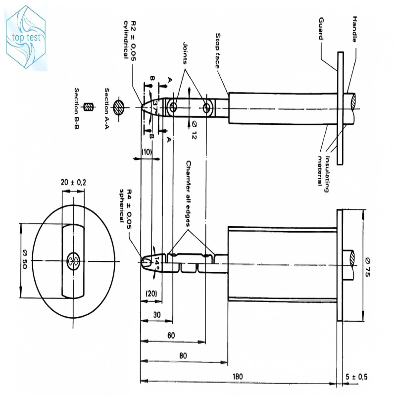 Core Function: Mimics finger movement to test access to hazardous live parts; prevents over-insertion via baffle; ensures IEC 61032 compliance